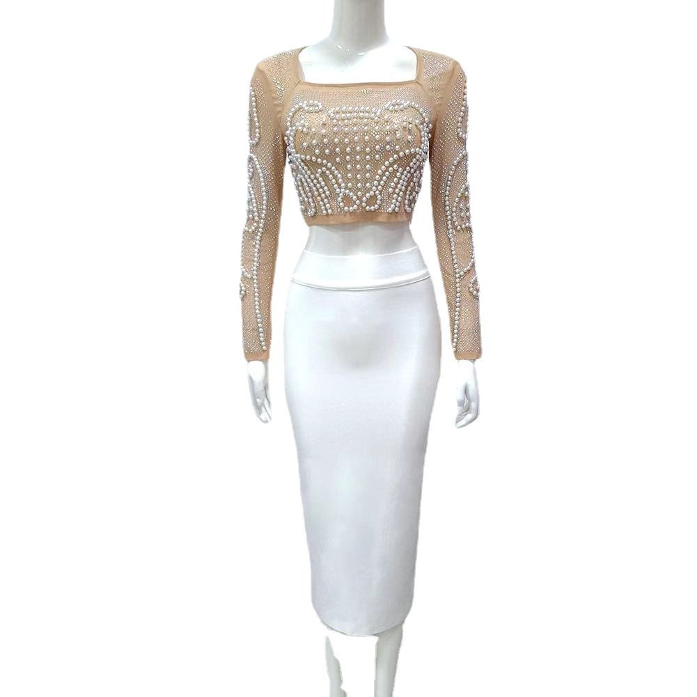 an fashion bage skirt suits, elegant nail nails long -sleeved T -shirt medium long skirt two -piece set