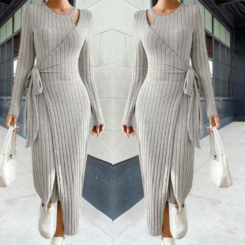 an new summer women’s clothing round collar solid color long -sleeved lace waist knitted dress