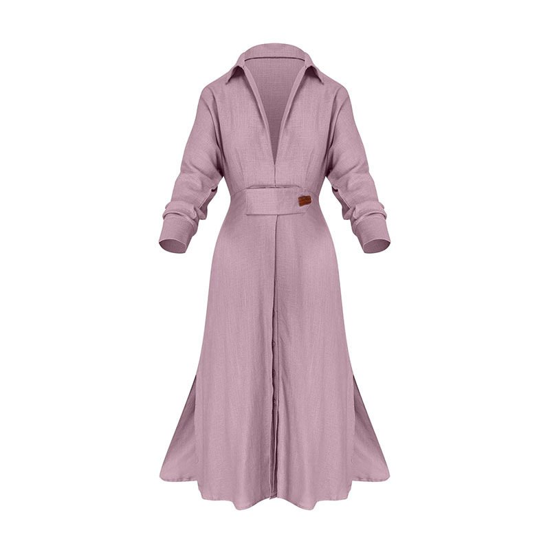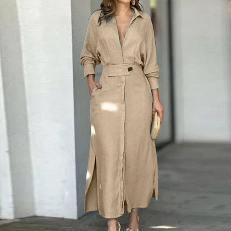 an women’s summer new temperament V -neck high -waisted long -sleeved pocket solid color cardigan dress