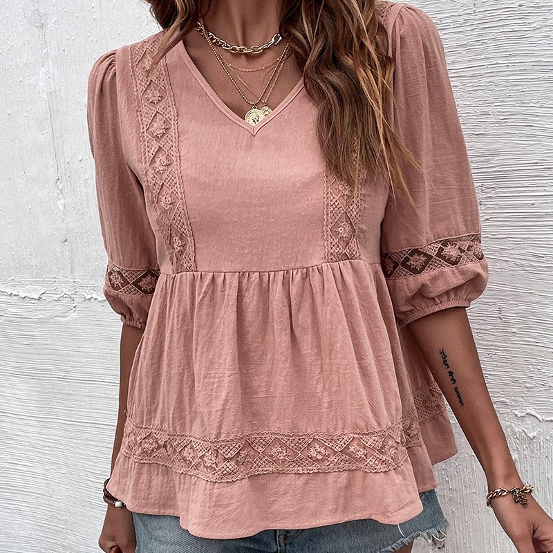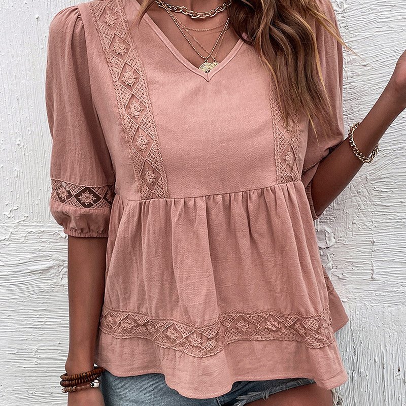 Independence Station Summer an retro stitching Top Solid Color Mid -sleeve Lame V -neck shirt