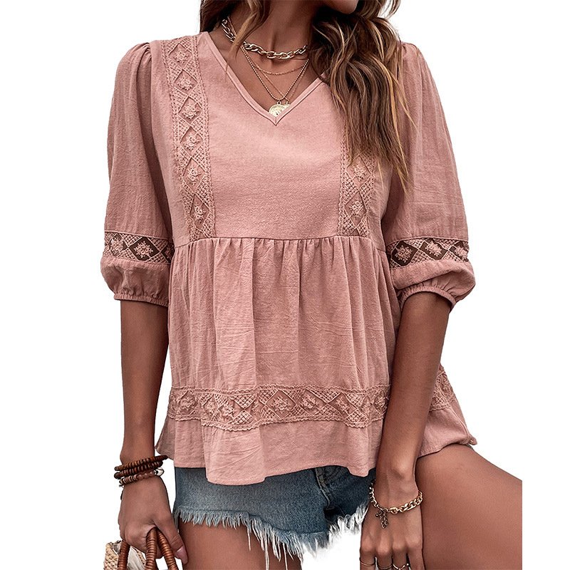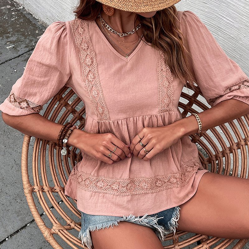 Be the first to review “Independence Station Summer an retro stitching Top Solid Color Mid -sleeve Lame V -neck shirt”