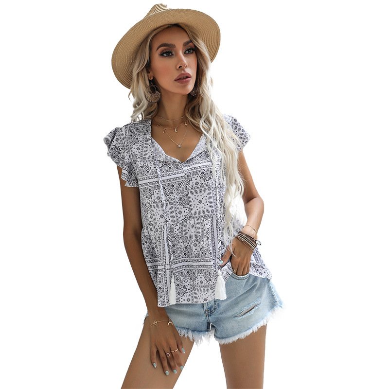 ‘s new an waist tops, straw Su v -neck short -sleeved printed retro shirt women