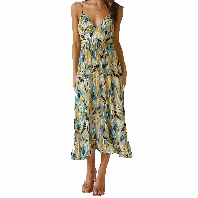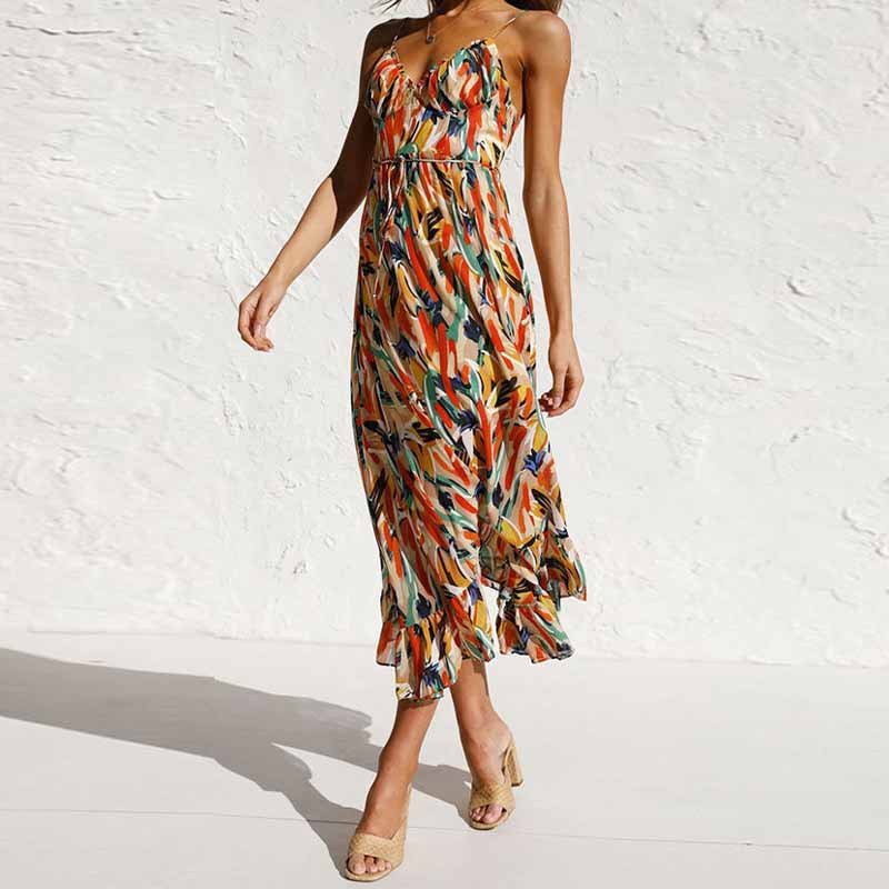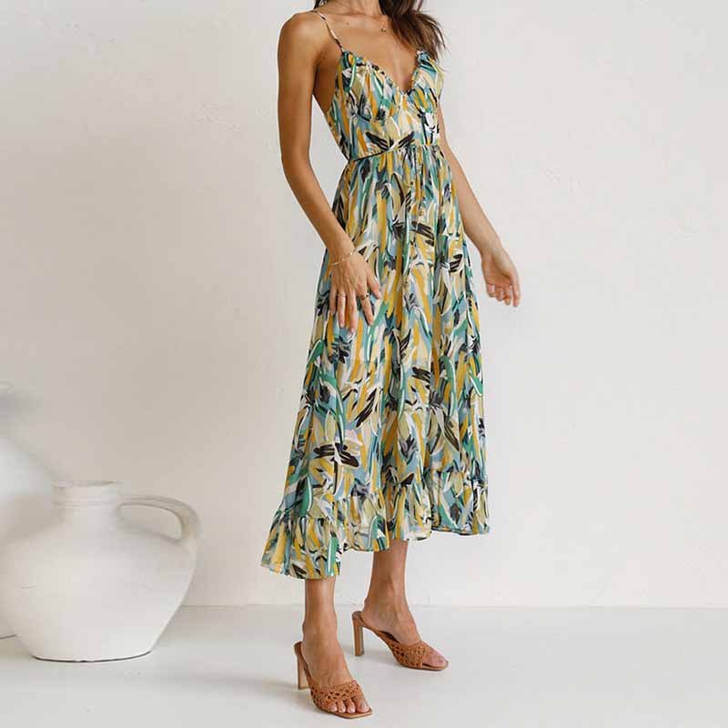 ‘s new an women’s fresh printing temperament V -neck loose long sling dress 661