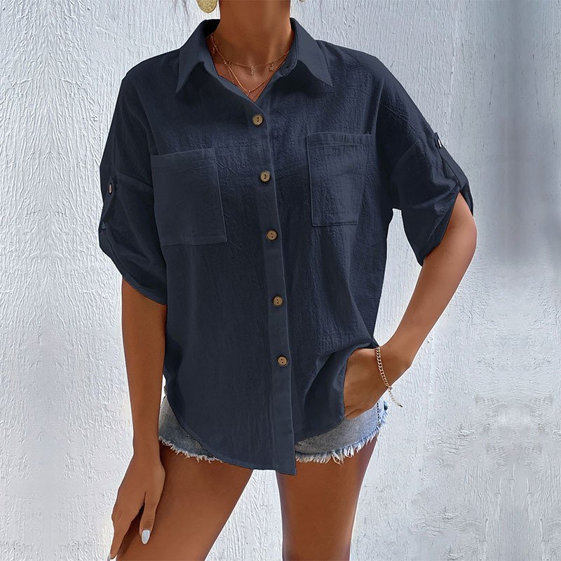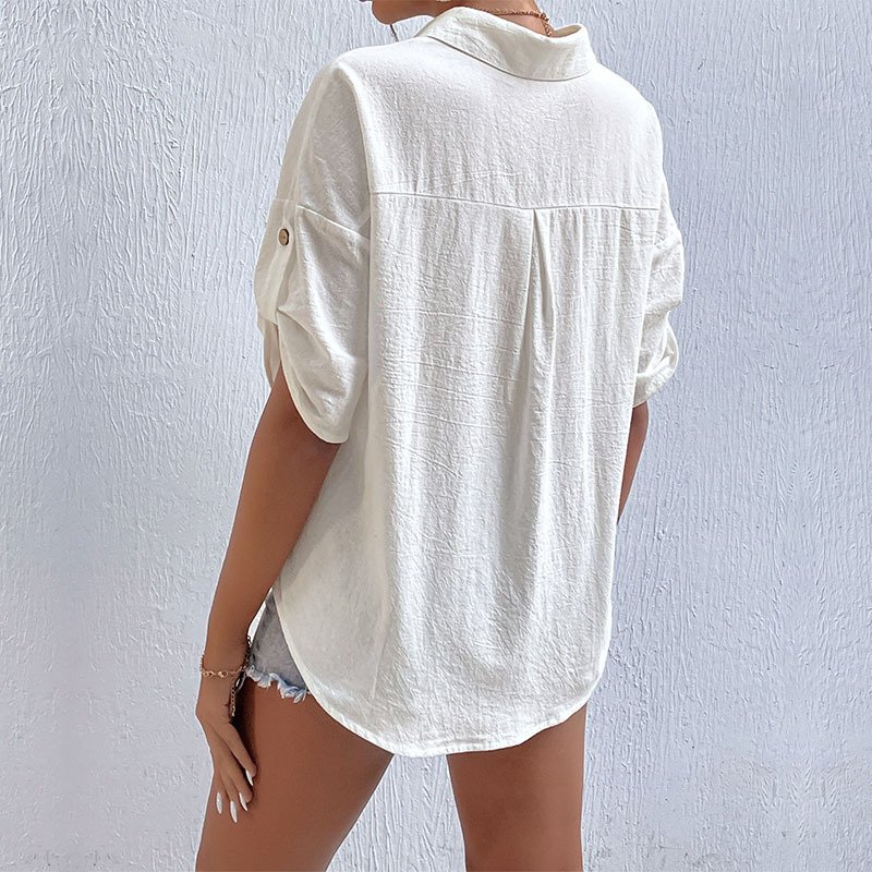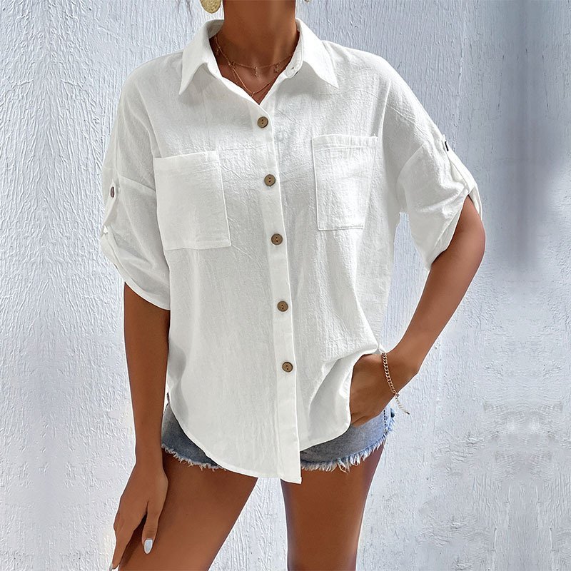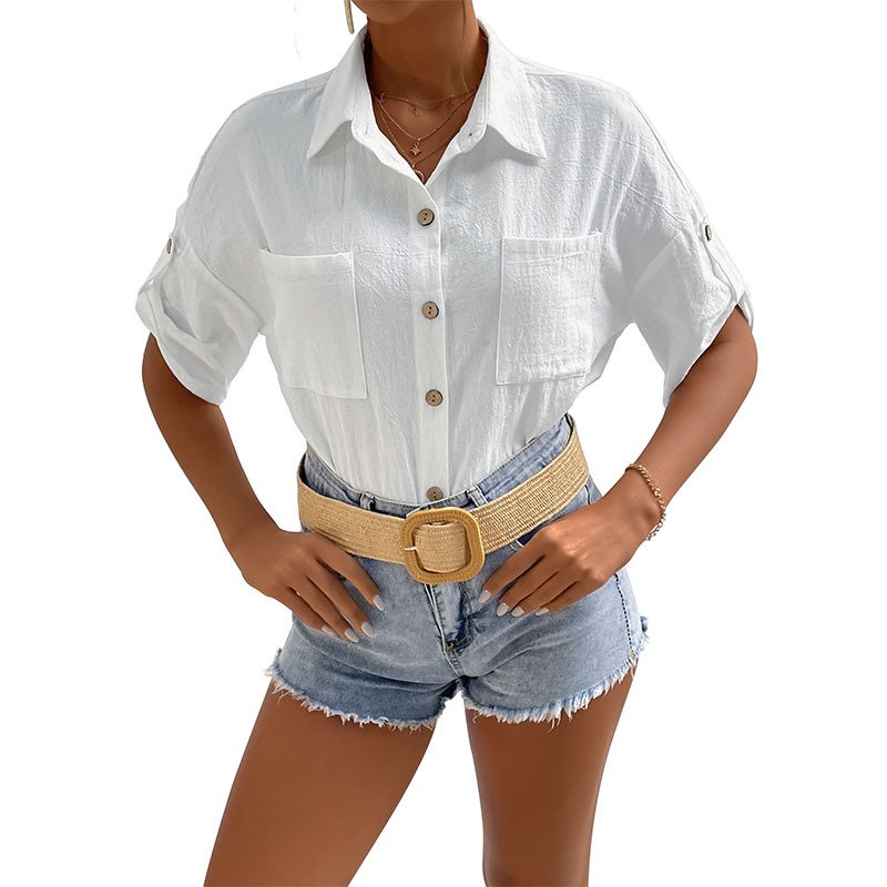 ‘s new summer an button cardigan cotton linen shirt short -sleeved pocket lapel shirt female