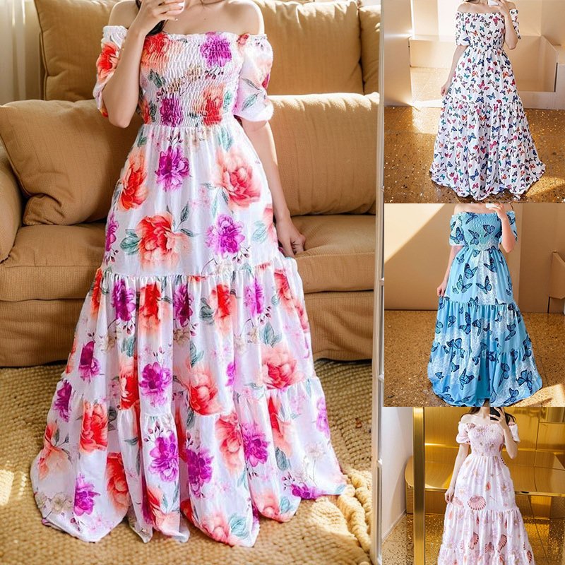 ‘s new summer an women’s outfit of off -the -shoulder princess skirt printing shoulders
