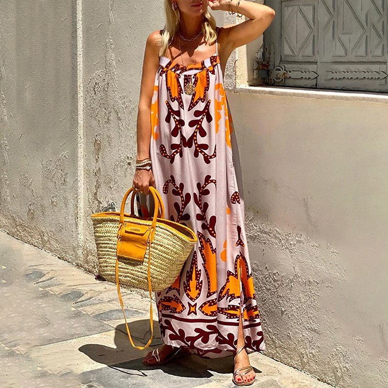 Summer new Women’s Graffiti Printing Vacation Wind high waist thin suspender dress
